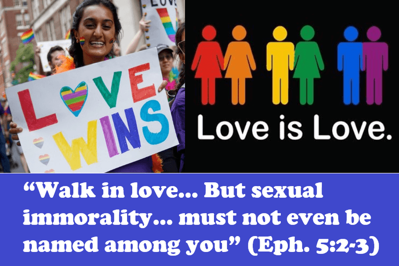 Modern Western culture, at least since the 1960’s, typically equates love with sexual freedom. The language of love has been adopted by those promoting LGBTQ+ lifestyle choices, so that banners proclaiming messages such as “Love Wins” or “Love Is Love” are commonplace in Gay Pride marches and on social media. This use of “love” language is so ubiquitous that it is almost automatic for a person to feel they are being unloving if they speak against homosexual behavior.
